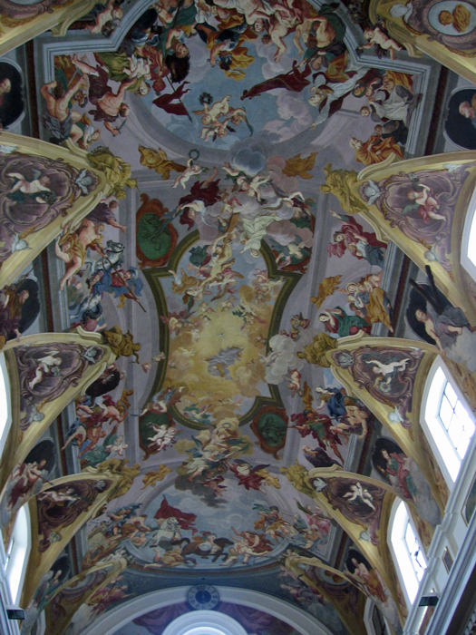 Unfortunately, however, he didn’t paint any of his famous frescoes there. According to the tourist info pamphlet, “the press of business elsewhere” prevented him from undertaking this part of the job. Giulio Quaglio, a northern Italian artist who painted in the same illusionist style, was chosen to do it. (He was the son of a fresco painter also named Giulio Quaglio [“the elder”] and belonged to a large family of artists who lived and worked in northwestern Italy, not far from Slovenia, but I couldn’t find out much more about him.)