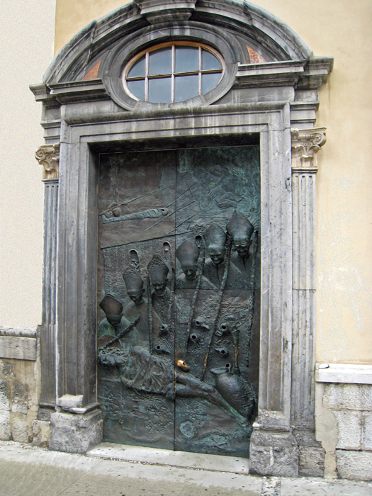 Both doors are the work of Mirsad Begić, a Slovene sculptor whose background is Bosnian. (And presumably Muslim, since his surname indicates that one of his ancestors was the son of a bey — a Turkish title referring to a governor or minor noble. Beg is the usual form in the Slavic parts of the Balkans. )