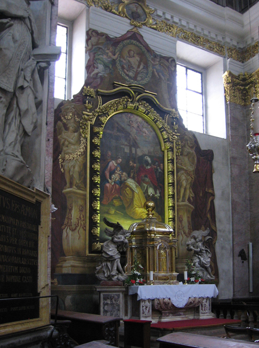 The new, larger dome added to the cathedral in 1841 was the work of the local architect Gregor Maček; it was painted by Matevs Langus, who also contributed to the later renovation of the interior done in 1859–1860. This picture shows the “Corpus Christi side altar,” which was created (both the altar and the two angels on it) by Robba. The painting of the Adoration of the Magi was made by Langus a century later.