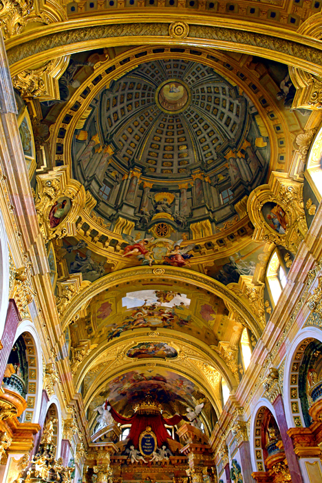 Architecture was more of a sideline with Pozzo, taken up in his later years, and the Oxford Dictionary of Art describes it as “unexciting compared with his paintings and the engravings in his treatise [on perspective].” But although he may not have blazed any new trails, he worked within what was now a well established Jesuit tradition, and St. Nicholas Cathedral is a worthy example, even though its urban setting makes the outside of the building difficult to see as a whole.