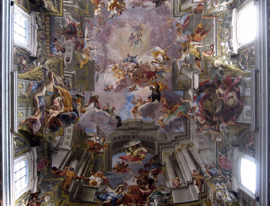 Andrea Pozzo had become a Jesuit at the age of 24, having been trained as an artist since the age of 17. He became a lay brother, a term that usually suggests a man who is not ordained as a priest, but serves his religious community by performing menial work. However, the Jesuits also have a long tradition of unordained lay brothers whose role is to provide specialized expertise. (The present curator of the Vatican Observatory is an example.) In the course of his career, Brother Andrea Pozzo designed and painted church interiors, planned church structures, trained students in the arts, and published a highly regarded book on the rules and techniques of perspective that was translated into several languages. He is best known as a master of illusionist painting, a style that depends heavily on a mastery of perspective. Pozzo’s most famous work is this ceiling fresco in the Roman Jesuit Church of Sant’Ignazio, where the allegorical figures (representing Jesuit evangelical work on four continents) seem to float in a space that extends far upward, though everything — even the windows and the light that seems to come through them — is painted on a flat or only slightly curved surface.