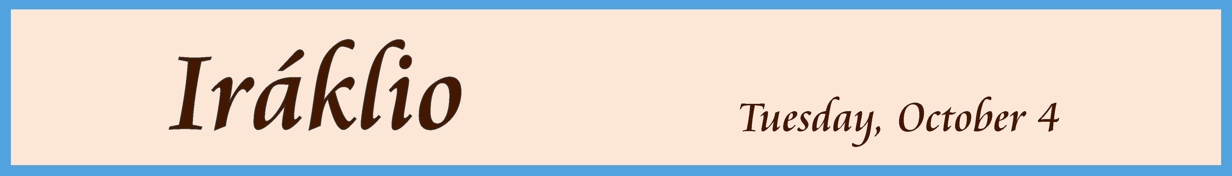 The longest bus ride we’d taken so far was was the one that had brought us here from Réthymno. It took 90 minutes, which was very nearly more than my bladder could bear. But the ride from Iráklio to Sitía would take 210 minutes—3½ hours. The bus was scheduled to stop at Áyio Nikólaos, a large city about 90 minutes from Iráklio, but we couldn’t tell from the timetable whether the stop would be long enough to permit a restroom visit—and even if it was, the last part of the journey would be longer than the first.